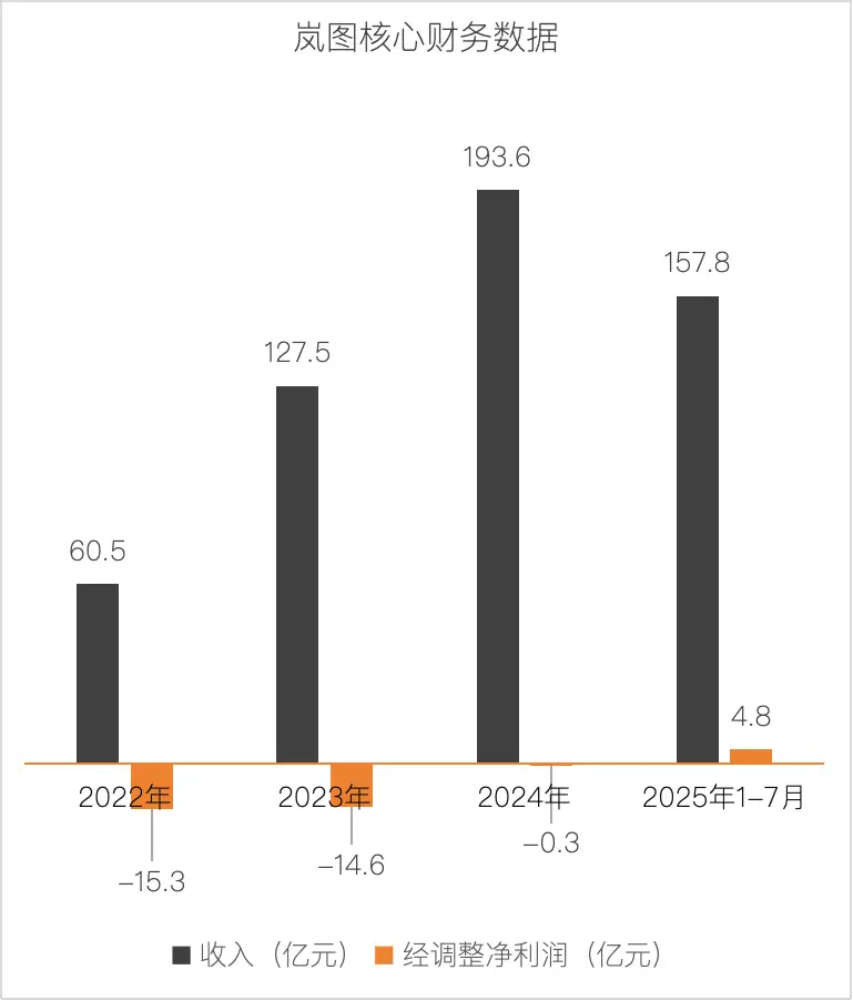 招股書(shū)給出了答案。根據(jù)經(jīng)調(diào)整凈利潤(rùn)口徑,從2022年虧損15.3億元,到2024年僅虧0.25億元,再到2025年前7個(gè)月盈利4.79億元,嵐圖的盈利能力在快速改善。