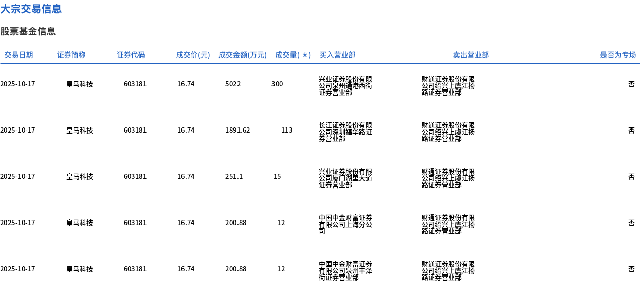 10月17日,皇馬科技大宗交易成交500萬(wàn)股,成交額8370萬(wàn)元,占當(dāng)日總成交額的15.89%,成交價(jià)16.74元,較市場(chǎng)收盤價(jià)17.43元折價(jià)3.96%。