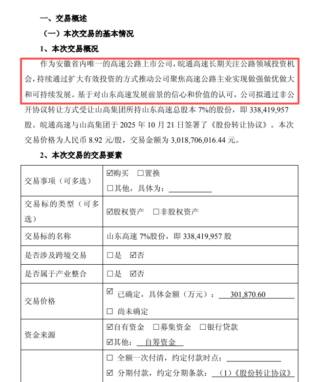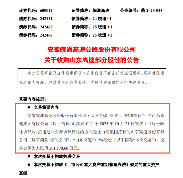 10月21日,皖通高速發(fā)布關(guān)于收購山東高速部分股份的公告。根據(jù)公告,皖通高速與山東高速集團(tuán)有限公司(以下簡稱“山高集團(tuán)”)于2025年10月21日簽署了《股份轉(zhuǎn)讓協(xié)議》,擬通過非公開協(xié)議轉(zhuǎn)讓的方式受讓山高集團(tuán)持有的山東高速股份有限公司(以下簡稱“山東高速”)7%股份,交易金額為人民幣30.19億元。