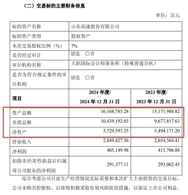 根據(jù)皖通高速公告,截至2024年12月31日,山東高速營業(yè)收入284億元,凈利潤40.5億元,資產(chǎn)總額1617億元,凈資產(chǎn)573億元。