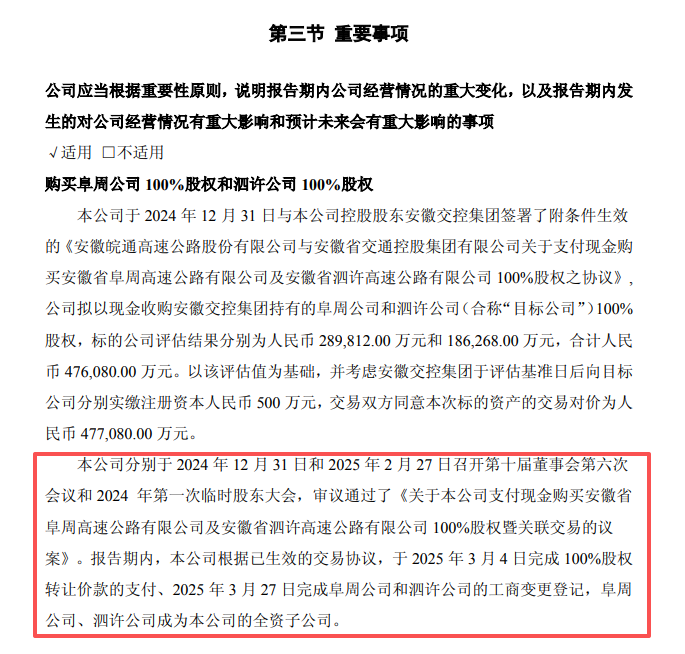 2025年2月27日,皖通高速召開第十屆董事會第六次會議和 2024 年第一次臨時股東大會,審議通過了《關(guān)于本公司支付現(xiàn)金購買安徽省阜周高速公路有限公司及安徽省泗許高速公路有限公司 100%股權(quán)暨關(guān)聯(lián)交易的議案》。