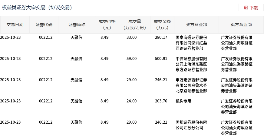 10月23日,天融信大宗交易成交174萬股,成交額1477.26萬元,占當日總成交額的3.52%,成交價8.49元,較市場收盤價9.59元折價11.47%。