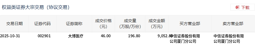 10月31日,大博醫(yī)療大宗交易成交196.8萬(wàn)股,成交額9052.8萬(wàn)元,占當(dāng)日總成交額的28.41%,成交價(jià)46元,較市場(chǎng)收盤(pán)價(jià)50.04元折價(jià)8.07%。