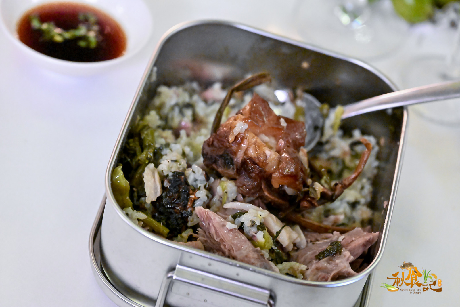 煙火氣和人情味,一直是青浦對(duì)社會(huì)各界至高的“心引力”。著名美食評(píng)論家沈宏非激動(dòng)地表示:“每一年秋食記的高潮,照例由一鍋香噴噴的菜飯引爆,這一次也不例外。但例外的是,今年移師至淀山湖畔的農(nóng)場(chǎng),終于得以一逞戶外柴灶煮菜飯之快,柴是香樟木枝葉,米是剛打下來的薄稻新米,米十斤、菜十斤,一口巨大鐵鍋不緊不慢地燜熟燜香。左右兩口鐵鍋,一口燉商榻清湯羊肉,一口燜新稻草扎肉,待三鍋俱熟,同揭。鋼種飯盒里,熱騰騰的菜飯打底,左加一方稻草扎肉,右壓一坨清燉帶皮羊肉?!?/p>
