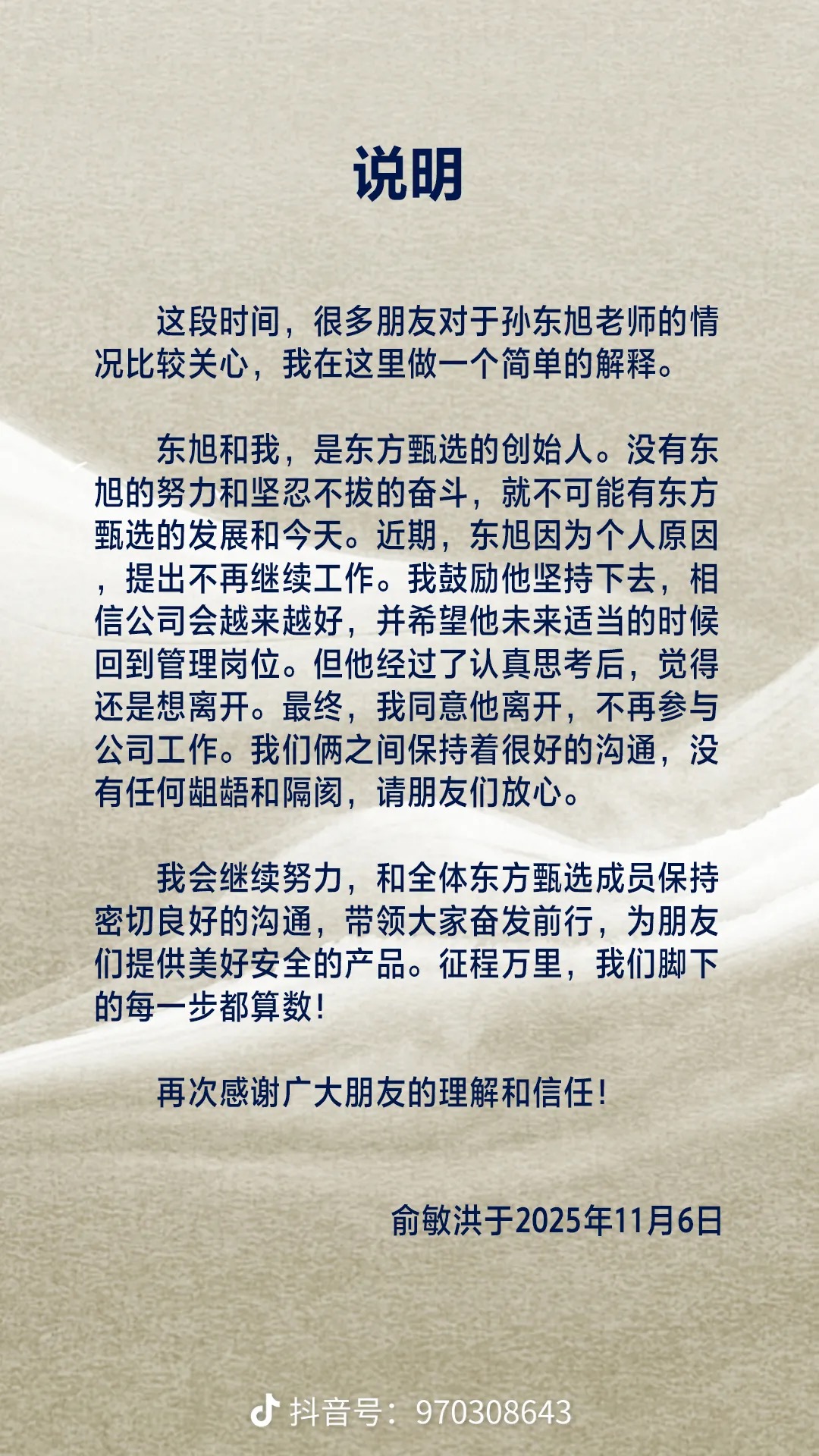11月6日,俞敏洪發(fā)文確認(rèn)孫東旭離職。俞敏洪在說(shuō)明中提到,“東旭和我,是東方甄選的創(chuàng)始人。沒(méi)有東旭的努力和堅(jiān)忍不拔的奮斗,就不可能有東方甄選的發(fā)展和今天。近期,東旭因?yàn)閭€(gè)人原因提出不再繼續(xù)工作。我鼓勵(lì)他堅(jiān)持下去,相信公司會(huì)越來(lái)越好,并希望他未來(lái)適當(dāng)?shù)臅r(shí)候回到管理崗位。但他經(jīng)過(guò)了認(rèn)真思考后,覺(jué)得還是想離開。最終,我同意他離開,不再參與公司工作。我們倆之間保持著很好的溝通,沒(méi)有任何齟齬和隔閡,請(qǐng)朋友們放心?!?/p>