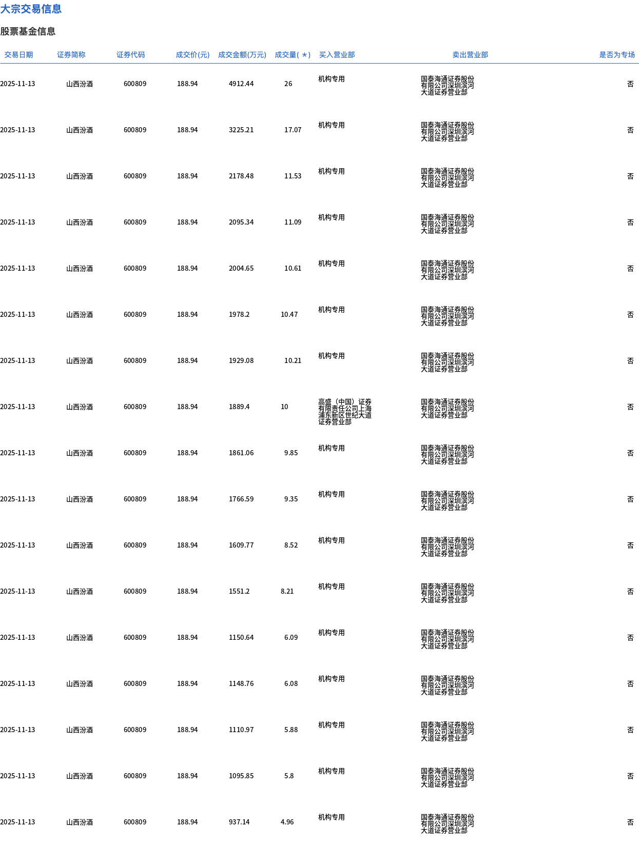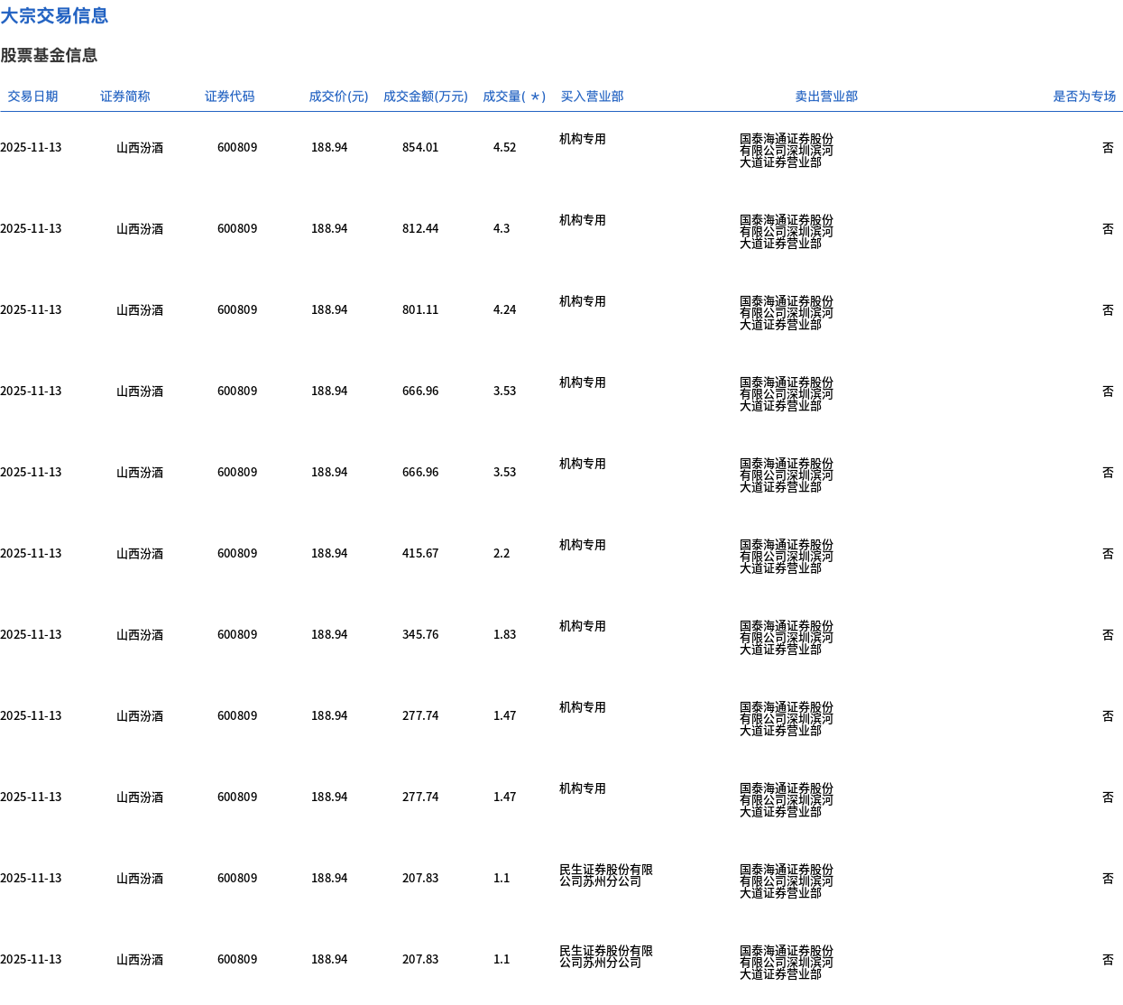 11月13日,山西汾酒大宗交易成交201.01萬股,成交額3.8億元,占當(dāng)日總成交額的26.34%,成交價188.94元,較市場收盤價201元折價6%。