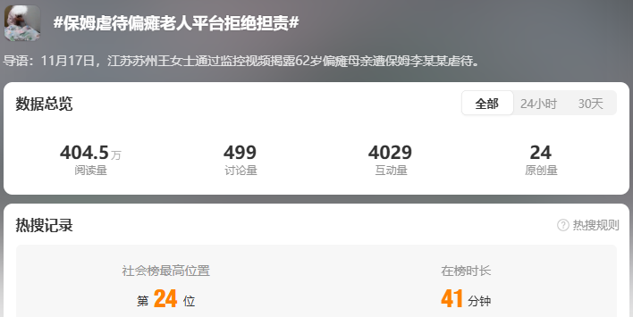 而上述事件相關(guān)話題#保姆虐待偏癱老人平臺拒絕擔(dān)責(zé)#和#保姆虐待辱罵偏癱老人稱死了活該#均登上微博熱搜,分別最高占據(jù)社會榜的第24位和熱搜榜的第38位,閱讀量分別達(dá)404.5萬和556.4萬。