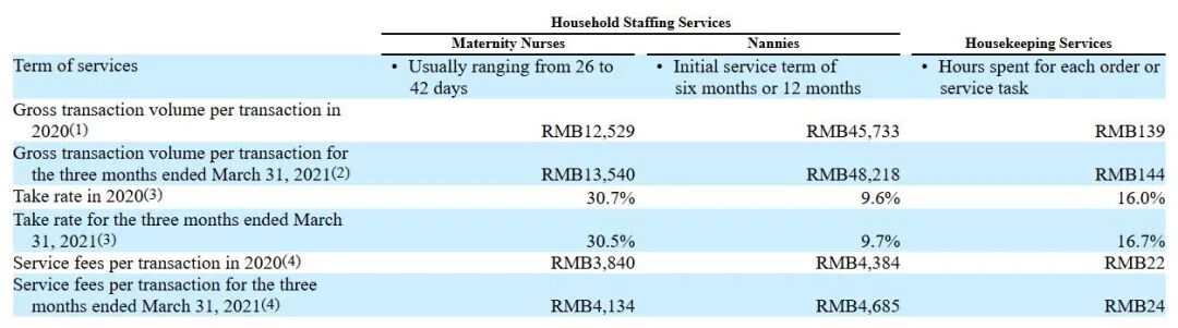 其中,月嫂的服務(wù)周期約為26天—42天,2020年和2021年第一季度平均每次在平臺提供服務(wù)能分別得到收入12529元和13540元。不過平臺對單次服務(wù)的抽成比例較高,分別為30.7%和30.5%,分別抽取3840元和4134元。也就是月嫂平均每次能實(shí)際賺到8689元和9406元。