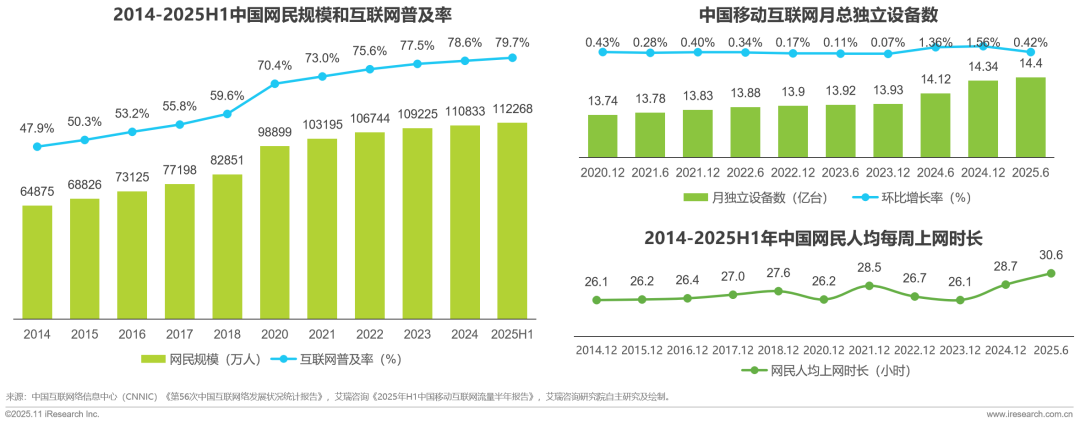 根據(jù)中國互聯(lián)網(wǎng)絡(luò)信息中心(CNNIC)《第56次中國互聯(lián)網(wǎng)絡(luò)發(fā)展?fàn)顩r統(tǒng)計(jì)報(bào)告》,2014-2025H1年中國網(wǎng)民規(guī)模從6.49億增至11.2億,普及率上升至79.7%,中國移動(dòng)互聯(lián)網(wǎng)設(shè)備規(guī)模逼近增長極限,截至2025年H1已達(dá)14.4億臺(tái);截至2025年6月,中國網(wǎng)民的人均每周上網(wǎng)時(shí)長為30.6個(gè)小時(shí); 網(wǎng)民的數(shù)字生活滲透趨近飽和??梢娭袊ヂ?lián)網(wǎng)用戶交互行為已進(jìn)入存量穩(wěn)態(tài)化階段?;ヂ?lián)網(wǎng)普及率逼近80%后整體增速放緩,用戶規(guī)模增長紅利見頂后,互聯(lián)網(wǎng)競爭邁入存量精耕的新階段。