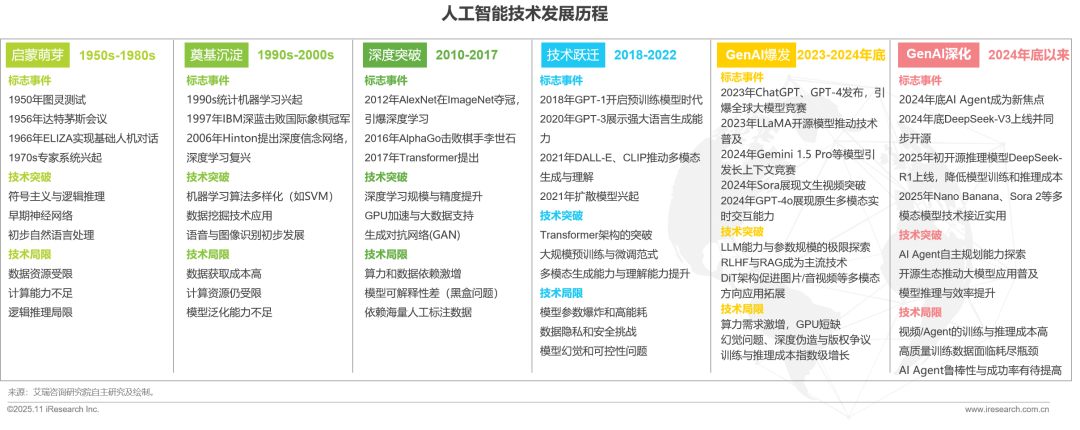 人工智能技術(shù)演進(jìn)呈現(xiàn)從符號(hào)邏輯到數(shù)據(jù)驅(qū)動(dòng)、從專用模型到通用智能的螺旋式上升軌跡。早期符號(hào)主義通過規(guī)則推理構(gòu)建專家系統(tǒng),但受限于知識(shí)獲取瓶頸;統(tǒng)計(jì)學(xué)習(xí)時(shí)代通過SVM等算法實(shí)現(xiàn)模式識(shí)別突破,但模型通用性不足;深度學(xué)習(xí)革命以CNN/RNN架構(gòu)解決高維數(shù)據(jù)難題,卻面臨可解釋性與能耗挑戰(zhàn);大模型范式以Transformer為核心,通過預(yù)訓(xùn)練+微調(diào)實(shí)現(xiàn)跨領(lǐng)域遷移,推動(dòng)生成式AI爆發(fā)與應(yīng)用落地?,F(xiàn)階段人工智能技術(shù)與垂直場(chǎng)景深度耦合進(jìn)入應(yīng)用爆發(fā)期。