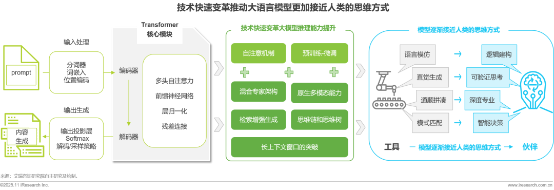 大語言模型(LLM)技術(shù)發(fā)展至今已達(dá)到相對(duì)成熟的階段,其Transformer架構(gòu)和“預(yù)訓(xùn)練-微調(diào)”范式已經(jīng)成為行業(yè)標(biāo)準(zhǔn),該架構(gòu)的核心是自注意力機(jī)制,它將文本“詞元化”并進(jìn)行并行處理,使模型能夠動(dòng)態(tài)衡量序列中任意詞語之間的關(guān)系,從而構(gòu)建出對(duì)語言的深度全局理解。LLM的成熟度不僅體現(xiàn)在其穩(wěn)固的基礎(chǔ)架構(gòu),更體現(xiàn)在一系列前沿技術(shù)能力的快速涌現(xiàn)與融合:混合專家(MoE)架構(gòu)解決了規(guī)?;蕟栴};原生多模態(tài)能力打破了文本的單一限制;檢索增強(qiáng)生成(RAG)提供了事實(shí)錨點(diǎn);思維鏈(CoT)和思維樹(ToT)等推理框架賦予了其解決復(fù)雜問題的能力;而不斷擴(kuò)展的上下文窗口則解鎖了處理海量數(shù)據(jù)的潛力。這些能力使得新一代LLM在效率、可靠性和性能上實(shí)現(xiàn)了質(zhì)的飛躍,共同將LLM從一個(gè)簡單的文本生成工具推動(dòng)成為越來越趨近人類思維的智能決策者角色。