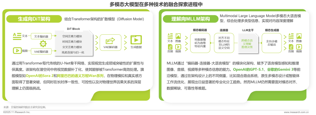 從概念上看,多模態(tài)大模型可以視為能夠識(shí)別和處理多種類型數(shù)據(jù)(文本、圖像及音視頻等)的輸入輸出、實(shí)現(xiàn)跨模態(tài)理解和生成任務(wù)的人工智能模型。艾瑞將其分為“以DiT架構(gòu)為代表的生成向”和“以MLLM架構(gòu)為代表的理解向”兩類:生成向模型基于DiT架構(gòu),專注于視覺內(nèi)容的生成,但在跨模態(tài)信息處理上存在局限;理解向模型基于MLLM架構(gòu),擅長多模態(tài)分析與交互,但缺乏復(fù)雜視頻生成能力。由于受限于數(shù)據(jù)異構(gòu)性、模態(tài)對(duì)齊難度及算法復(fù)雜性,兩類模型尚未實(shí)現(xiàn)底層能力的有效融合。如何更好地整合不同模態(tài)的生成和理解,將是多模態(tài)模型發(fā)展的關(guān)鍵方向。