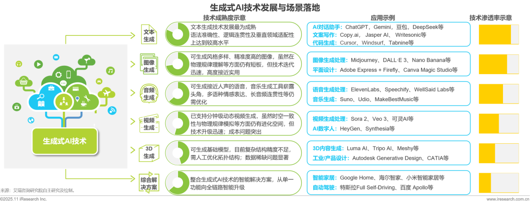 生成式AI技術(shù)突破了傳統(tǒng)判別式AI局限于識(shí)別的框架,轉(zhuǎn)向創(chuàng)造為核心的應(yīng)用模式。各模態(tài)的發(fā)展成熟度雖有參差,但應(yīng)用落地已呈現(xiàn)出百花齊放的繁榮景象。文本生成技術(shù)已進(jìn)入商業(yè)化成熟期,廣泛應(yīng)用于辦公、學(xué)習(xí)、文案、代碼等領(lǐng)域;圖像生成技術(shù)在藝術(shù)創(chuàng)作、產(chǎn)品設(shè)計(jì)和電商視覺等領(lǐng)域中實(shí)現(xiàn)規(guī)?;瘧?yīng)用;雖然個(gè)性化語音合成仍受限于情感表達(dá)與口音適配,但音頻生成技術(shù)已逐步在有聲讀物、音樂生成等垂直場(chǎng)景中應(yīng)用;視頻生成因Sora等模型突破進(jìn)入爆發(fā)前夜,引發(fā)市場(chǎng)高度關(guān)注,商業(yè)化應(yīng)用落地加快步伐。在產(chǎn)業(yè)端,整合生成式AI技術(shù)的智能解決方案,已在智能家居、自動(dòng)駕駛、智慧醫(yī)療、工業(yè)設(shè)計(jì)等復(fù)雜的垂直場(chǎng)景中驗(yàn)證價(jià)值。