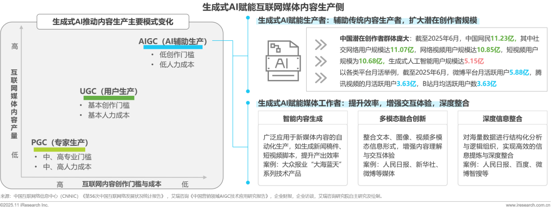 生成式AI正重塑互聯(lián)網(wǎng)內(nèi)容生產(chǎn)格局。技術(shù)突破使AI輔助生產(chǎn)突破專業(yè)壁壘,通過語義理解與多模態(tài)生成技術(shù),將用戶簡單的文字指令轉(zhuǎn)化為圖文、視頻等多元形態(tài)。社交平臺(tái)海量用戶基數(shù)為UGC提供天然土壤,我國11億網(wǎng)民均可能參與多模態(tài)內(nèi)容創(chuàng)作,凸顯了全民內(nèi)容創(chuàng)作趨勢(shì)。用戶基數(shù)與參與度形成多層次創(chuàng)作生態(tài),社交平臺(tái)成為核心載體。專業(yè)領(lǐng)域PGC則在AI驅(qū)動(dòng)下優(yōu)化工作流,提升優(yōu)質(zhì)內(nèi)容產(chǎn)能。技術(shù)普惠下,內(nèi)容生產(chǎn)正從精英化走向全民化,形成專業(yè)深度與創(chuàng)意廣度并存的新型創(chuàng)作生態(tài)。