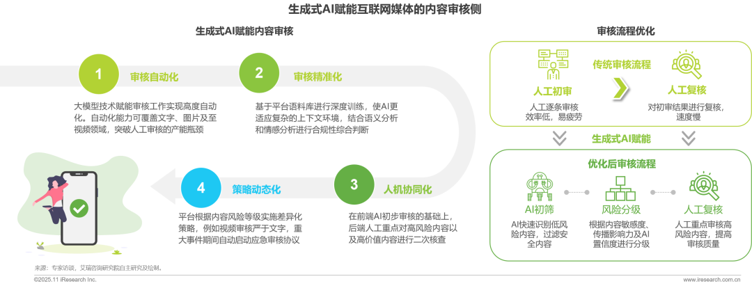 生成式AI技術(shù)可從自動(dòng)審核、精準(zhǔn)判定、人機(jī)互補(bǔ)、動(dòng)態(tài)策略四大方面,對(duì)內(nèi)容審核體系進(jìn)行革新賦能