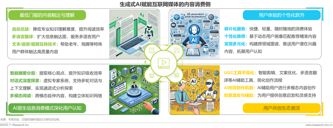 生成式AI技術(shù)對(duì)互聯(lián)網(wǎng)媒體內(nèi)容消費(fèi)端的革新呈現(xiàn)多維滲透:首先打破信息觸達(dá)壁壘,通過多語言翻譯、文本語音互轉(zhuǎn)等技術(shù)實(shí)現(xiàn)無障礙內(nèi)容獲取,把信息消費(fèi)門檻降到最低;其次重構(gòu)交互范式,以智能摘要、對(duì)話式咨詢等AI原生服務(wù)深化用戶理解,實(shí)現(xiàn)淺層瀏覽交叉深度探索的信息加工模式升級(jí);同時(shí)革新體驗(yàn)維度,基于動(dòng)態(tài)用戶畫像的精準(zhǔn)推薦系統(tǒng)結(jié)合碎片化服務(wù)適配,形成千人千面的伴隨式體驗(yàn),并借助跨領(lǐng)域興趣圖譜推送潛在內(nèi)容,持續(xù)拓展用戶認(rèn)知邊界;通過AI輔助創(chuàng)作工具降低UGC門檻,構(gòu)建用戶參與的內(nèi)容共創(chuàng)網(wǎng)絡(luò),使消費(fèi)者向產(chǎn)消者轉(zhuǎn)型,形成創(chuàng)作-消費(fèi)-再創(chuàng)作的產(chǎn)消價(jià)值循環(huán)。