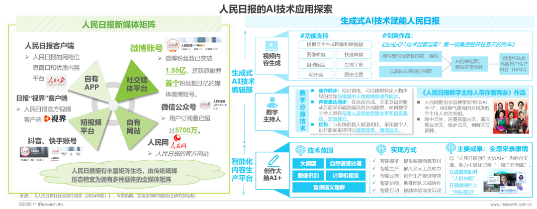 根據(jù)2025年5月發(fā)布的《人民日?qǐng)?bào)社社會(huì)責(zé)任報(bào)告(2024年度)》,人民日?qǐng)?bào)客戶端累計(jì)下載量突破2.9億次,微博粉絲數(shù)超1.55億,微信公眾號(hào)用戶訂閱量達(dá)5737萬,抖音賬號(hào)關(guān)注數(shù)達(dá)1.74億。在人工智能技術(shù)驅(qū)動(dòng)下,人民日?qǐng)?bào)運(yùn)用生成式AI技術(shù)提升視頻內(nèi)容創(chuàng)作效率,推出《生成式AI技術(shù)創(chuàng)意混剪!第一視角感受開往春天的列車》等作品。此外,該報(bào)還推出“兩會(huì)AI學(xué)習(xí)”專欄,采用多民族數(shù)字主持人播報(bào)新聞,并依托“創(chuàng)作大腦”AI+全息采錄眼鏡等設(shè)備,助力記者實(shí)現(xiàn)“一鏡到底”的全媒體采編流程。