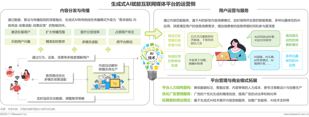 生成式AI技術(shù)從多個(gè)維度為互聯(lián)網(wǎng)媒體平臺(tái)的運(yùn)營工作注入動(dòng)能:在內(nèi)容分發(fā)環(huán)節(jié),AI貫穿用戶行為、設(shè)備、場(chǎng)景等多維度數(shù)據(jù),深度解析內(nèi)容并實(shí)現(xiàn)跨模態(tài)再生,優(yōu)化推薦路徑,以精準(zhǔn)實(shí)時(shí)推薦、多模態(tài)場(chǎng)景適配激活用戶需求,擴(kuò)大內(nèi)容傳播輻射范圍,提升分發(fā)效率;在用戶運(yùn)營環(huán)節(jié),通過優(yōu)質(zhì)內(nèi)容的精準(zhǔn)匹配、部署快速響應(yīng)的智能客服、多樣化AI應(yīng)用,深度契合用戶信息消費(fèi)需求,延長用戶停留時(shí)長,強(qiáng)化參與粘性。另外在平臺(tái)內(nèi)容管理與商業(yè)拓展層面,AI不僅可以幫助平臺(tái)優(yōu)化人力資源配置,降低基礎(chǔ)運(yùn)營成本,還可以優(yōu)化廣告?zhèn)€性化生成與精準(zhǔn)投放,更以內(nèi)容定制、創(chuàng)意廣告服務(wù)等新商業(yè)形態(tài)為平臺(tái)開拓商業(yè)價(jià)值增量的想象空間。