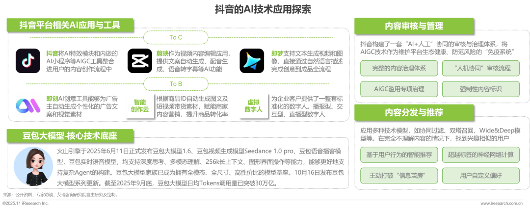 字節(jié)跳動(dòng)正圍繞其核心短視頻媒體平臺(tái)抖音,以豆包大模型為核心技術(shù)底座,將AIGC技術(shù)嵌入到短視頻媒體平臺(tái)“內(nèi)容生產(chǎn)-處理剪輯-發(fā)布呈現(xiàn)-營銷傳播”的每個(gè)環(huán)節(jié),形成一個(gè)由先進(jìn)推薦算法驅(qū)動(dòng),集內(nèi)容創(chuàng)作、社交互動(dòng)與商業(yè)變現(xiàn)于一體的生態(tài)系統(tǒng)。2025年6月11日豆包大模型1.6版本正式發(fā)布,包括視頻生成模型、語音播客模型、實(shí)時(shí)語音模型等多樣化模型技術(shù)矩陣,均支持深度思考、多模態(tài)理解、256k長上下文、圖形界面操作等能力,并在10月16日發(fā)布系列持續(xù)更新,支持抖音平臺(tái)形成“視頻創(chuàng)作工具-內(nèi)容平臺(tái)-商業(yè)化服務(wù)”的全鏈路產(chǎn)品矩陣。