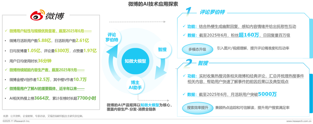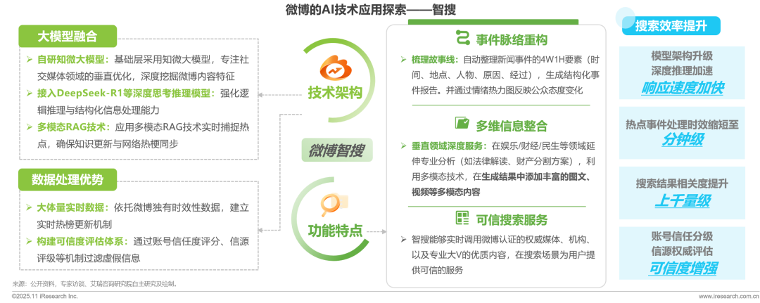 智搜是微博于2024年下半年開始重點(diǎn)打造的AI搜索產(chǎn)品,定位為“總結(jié)式信息消費(fèi)平臺(tái)”,旨在通過大語言模型技術(shù)重構(gòu)搜索體驗(yàn)。結(jié)合微博自研知微大模型、DeepSeek-R1以及多模態(tài)RAG技術(shù),自動(dòng)整理新聞事件的4W1H要素,在娛樂/財(cái)經(jīng)/民生等多種專業(yè)領(lǐng)域延伸深度分析,幫助用戶“秒懂熱點(diǎn)”,降低信息篩選成本,推動(dòng)微博搜索從傳統(tǒng)關(guān)鍵詞匹配向一站式智能搜索轉(zhuǎn)型。截至2025年6月,智搜月活躍用戶已突破5000萬。