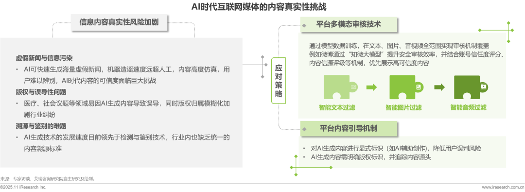AI技術(shù)為內(nèi)容創(chuàng)作賦予了高效與便捷,但背后潛藏的風(fēng)險(xiǎn)同樣不容忽視,如基于生成式AI技術(shù)炮制的虛假新聞、偽造影像等信息武器可直接沖擊社會(huì)信任體系。與此同時(shí),算法生成內(nèi)容的可靠性存在顯著差異,低質(zhì)量輸出易形成認(rèn)知偏差,進(jìn)而扭曲公眾的價(jià)值判斷與行為選擇。當(dāng)受眾習(xí)慣性接受算法投喂的碎片化信息,缺乏批判性思考與深度解讀時(shí),不僅會(huì)導(dǎo)致群體性認(rèn)知能力退化,更讓監(jiān)管體系面臨技術(shù)迭代與風(fēng)險(xiǎn)防控的雙重壓力。面對(duì)技術(shù)雙刃劍,行業(yè)形成多維度防御體系:互聯(lián)網(wǎng)媒體平臺(tái)通過自研大模型實(shí)現(xiàn)跨模態(tài)審核效率倍增,建立內(nèi)容溯源追蹤與可信度評(píng)級(jí)機(jī)制,對(duì)AI生成內(nèi)容實(shí)施顯式標(biāo)識(shí)制度,從技術(shù)治理與規(guī)則約束雙重路徑守護(hù)信息真實(shí)性。