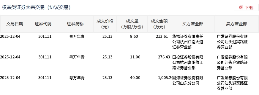 12月4日,粵萬年青大宗交易成交59.5萬股,成交額1495.24萬元,占當(dāng)日總成交額的1.36%,成交價25.13元,較市場收盤價27.92元折價9.99%。