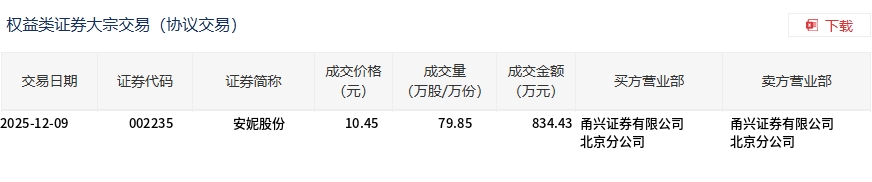 12月9日,安妮股份大宗交易成交79.85萬股,成交額834.43萬元,占當(dāng)日總成交額的18.63%,成交價10.45元,較市場收盤價11.24元折價7.03%。