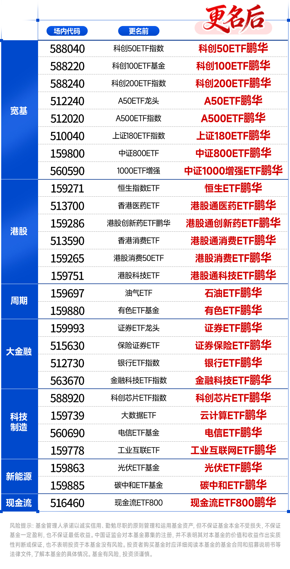 2026年1月15日,鵬華基金旗下27只ETF的擴位簡稱完成集中調整,統(tǒng)一采用“投資標的核心要素+ETF+鵬華”的命名結構。