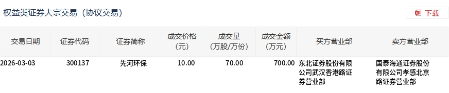 3月3日,先河環(huán)保大宗交易成交70萬股,成交額700萬元,占當日總成交額的2.7%,成交價10元,較市場收盤價10.88元折價8.09%。