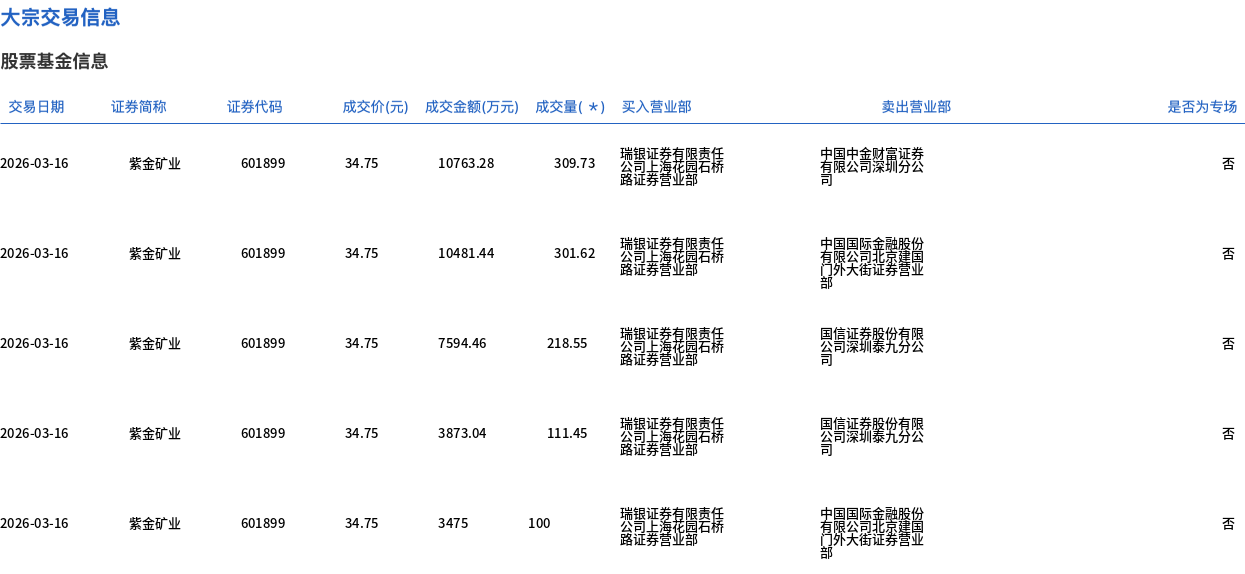 3月16日,紫金礦業(yè)大宗交易成交1041.35萬(wàn)股,成交額3.62億元,占當(dāng)日總成交額的2.44%,成交價(jià)34.75元,較市場(chǎng)收盤價(jià)34.75元持平。