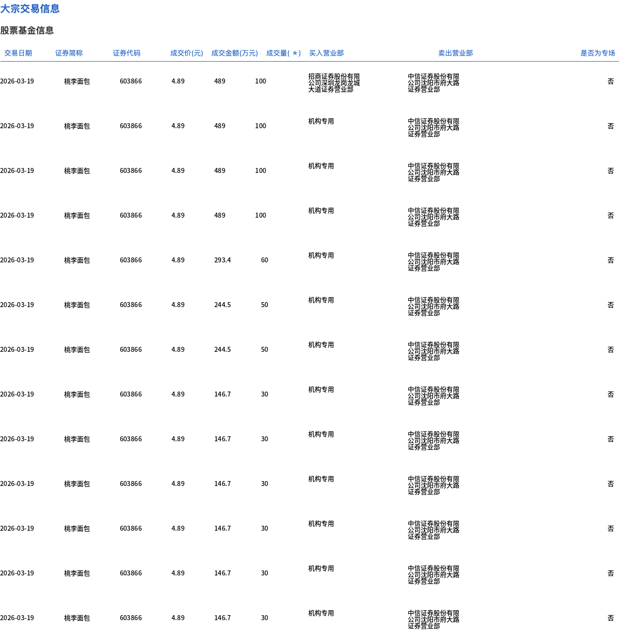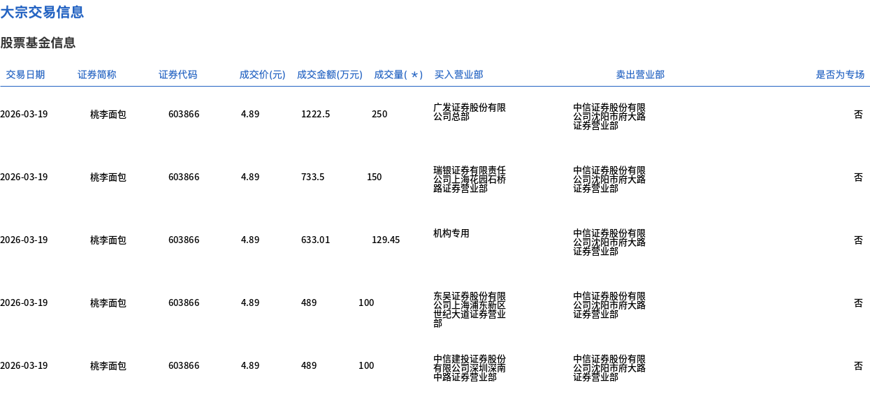 3月19日,桃李面包大宗交易成交1469.45萬股,成交額7185.61萬元,占當日總成交額的48.71%,成交價4.89元,較市場收盤價5.11元折價4.31%。