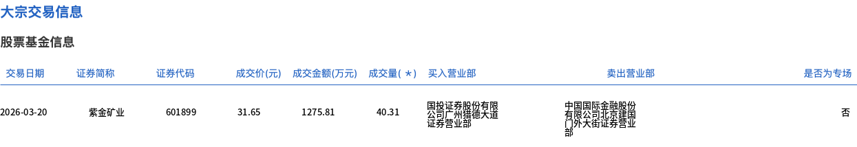 3月20日,紫金礦業(yè)大宗交易成交40.31萬股,成交額1275.81萬元,占當(dāng)日總成交額的0.1%,成交價(jià)31.65元,較市場收盤價(jià)31.65元持平。