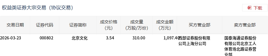 3月23日,北京文化大宗交易成交310萬股,成交額1097.4萬元,占當(dāng)日總成交額的17.06%,成交價(jià)3.54元,較市場收盤價(jià)3.8元折價(jià)6.84%。