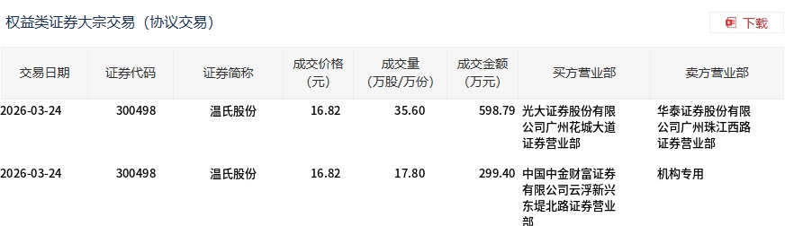 3月24日,溫氏股份大宗交易成交53.4萬(wàn)股,成交額898.19萬(wàn)元,占當(dāng)日總成交額的0.86%,成交價(jià)16.82元,較市場(chǎng)收盤(pán)價(jià)16.82元持平。
