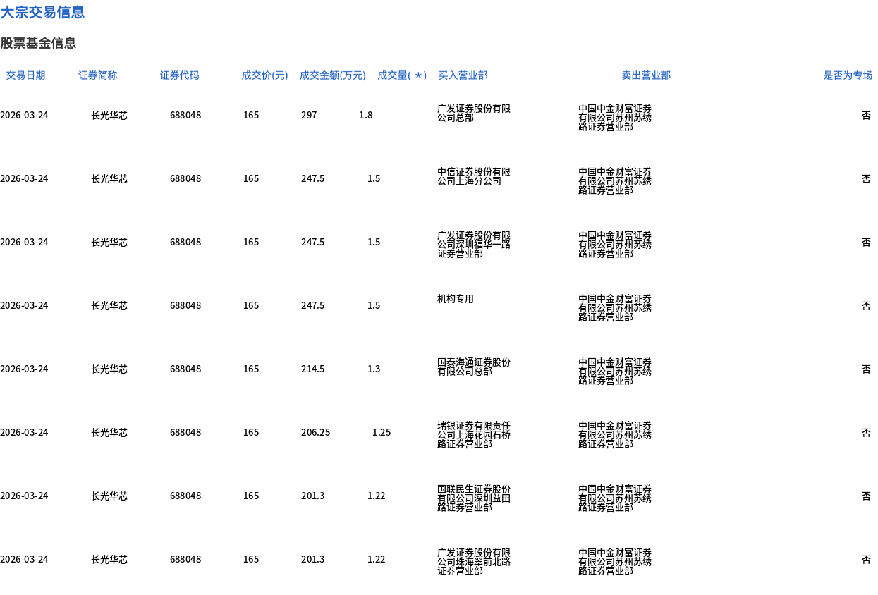 3月24日,長(zhǎng)光華芯大宗交易成交11.29萬(wàn)股,成交額1862.85萬(wàn)元,占當(dāng)日總成交額的0.56%,成交價(jià)165元,較市場(chǎng)收盤價(jià)195.99元折價(jià)15.81%。