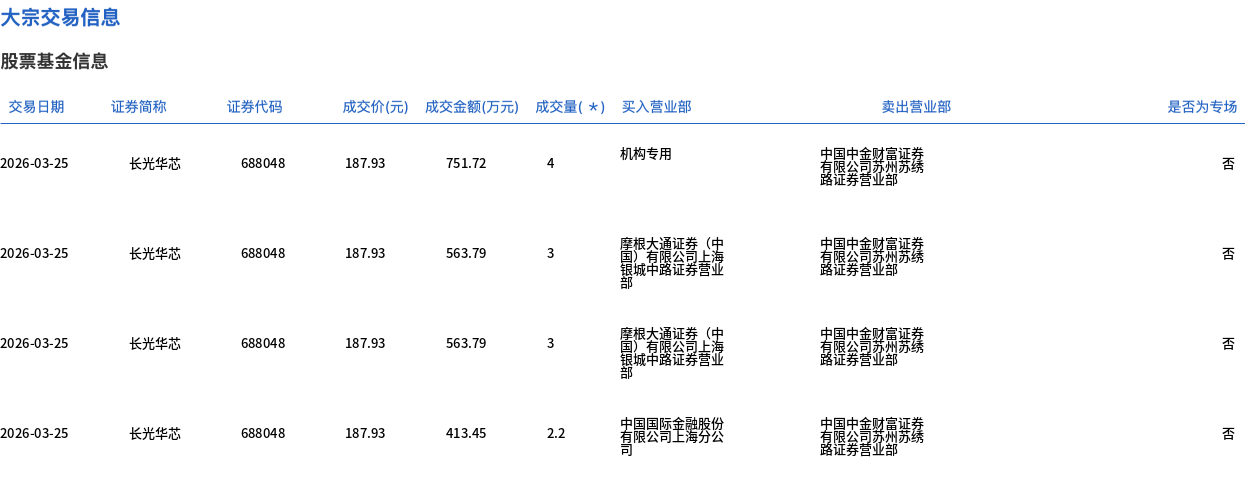 3月25日,長(zhǎng)光華芯大宗交易成交12.2萬(wàn)股,成交額2292.75萬(wàn)元,占當(dāng)日總成交額的0.55%,成交價(jià)187.93元,較市場(chǎng)收盤(pán)價(jià)224.18元折價(jià)16.17%。