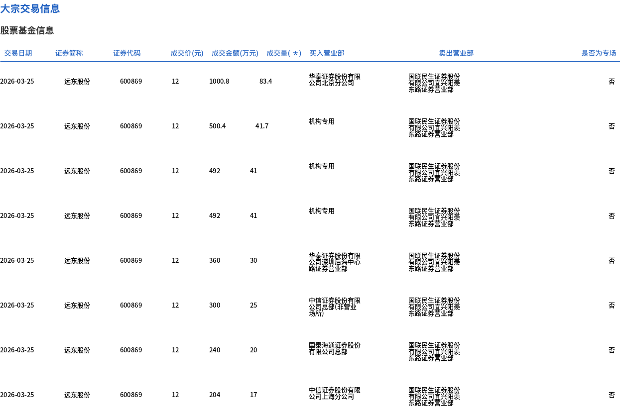 3月25日,遠(yuǎn)東股份大宗交易成交315.8萬股,成交額3789.6萬元,占當(dāng)日總成交額的3.71%,成交價(jià)12元,較市場收盤價(jià)13.24元折價(jià)9.37%。