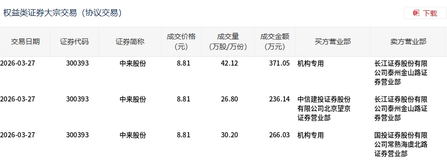 3月27日,中來股份大宗交易成交99.12萬股,成交額873.22萬元,占當(dāng)日總成交額的2.07%,成交價(jià)8.81元,較市場收盤價(jià)9.74元折價(jià)9.55%。