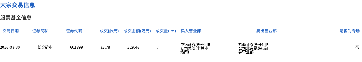 紫金礦業(yè)今日大宗交易平價成交7萬股,成交額229.46萬元