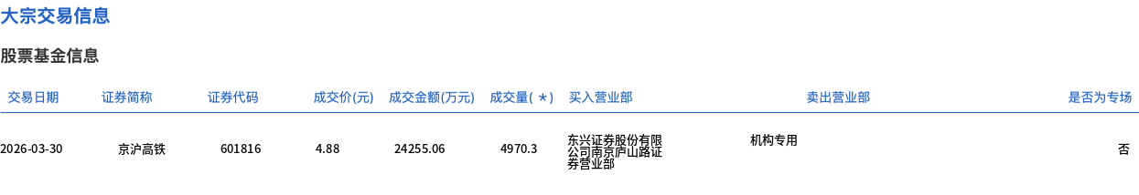 3月30日,京滬高鐵大宗交易成交4970.3萬股,成交額2.43億元,占當(dāng)日總成交額的31.12%,成交價(jià)4.88元,較市場收盤價(jià)5.07元折價(jià)3.75%。