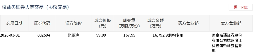 3月31日,比亞迪大宗交易成交167.95萬(wàn)股,成交額1.68億元,占當(dāng)日總成交額的2.6%,成交價(jià)99.99元,較市場(chǎng)收盤(pán)價(jià)105.25元折價(jià)5%。