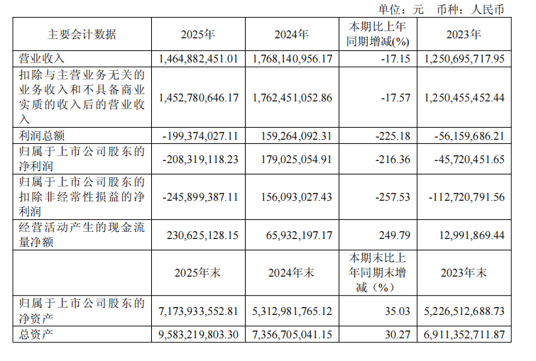 財(cái)務(wù)數(shù)據(jù)顯示,2025年天岳先進(jìn)實(shí)現(xiàn)營(yíng)業(yè)總收入14.65億元,較2024年的17.68億元下降17.15%。利潤(rùn)端壓力更為顯著,歸屬于上市公司股東的凈利潤(rùn)為-2.08億元,較上年的1.79億元大幅下滑216.36%;扣非后凈利潤(rùn)為-2.46億元?;久抗墒找鏋?0.47元。