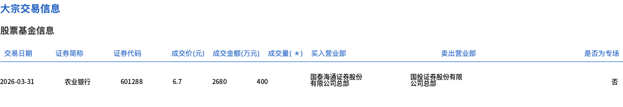 農(nóng)業(yè)銀行今日大宗交易平價成交400萬股,成交額2680萬元