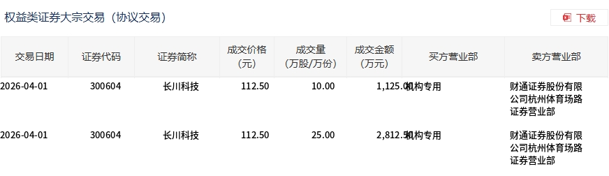 4月1日,長(zhǎng)川科技大宗交易成交35萬股,成交額3937.5萬元,占當(dāng)日總成交額的2.04%,成交價(jià)112.5元,較市場(chǎng)收盤價(jià)124.48元折價(jià)9.62%。
