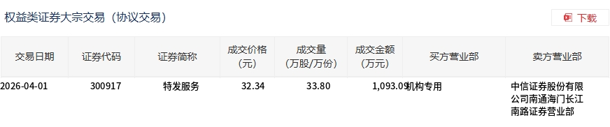 4月1日,特發(fā)服務(wù)大宗交易成交33.8萬股,成交額1093.09萬元,占當日總成交額的11.4%,成交價32.34元,較市場收盤價32.55元折價0.65%。