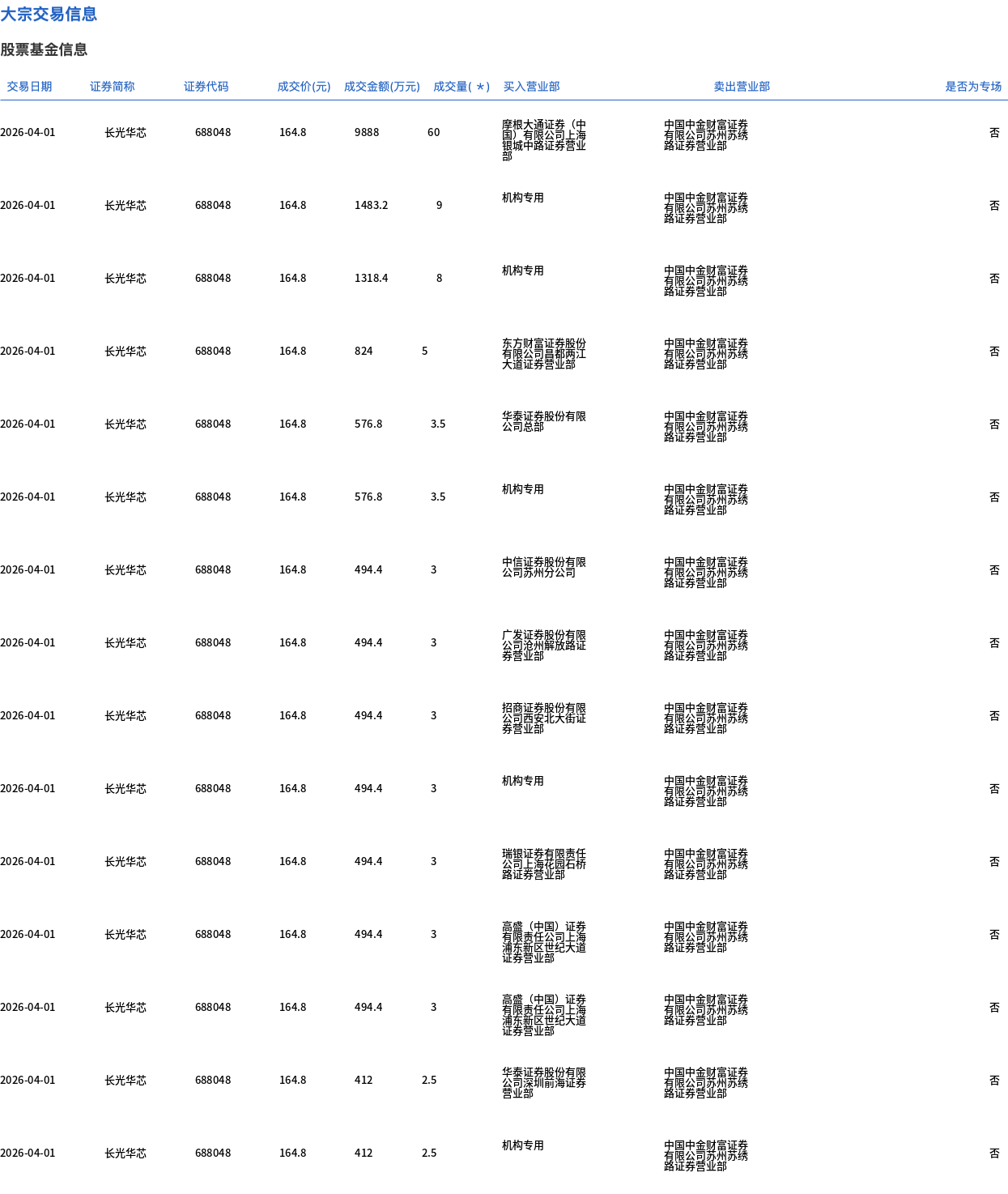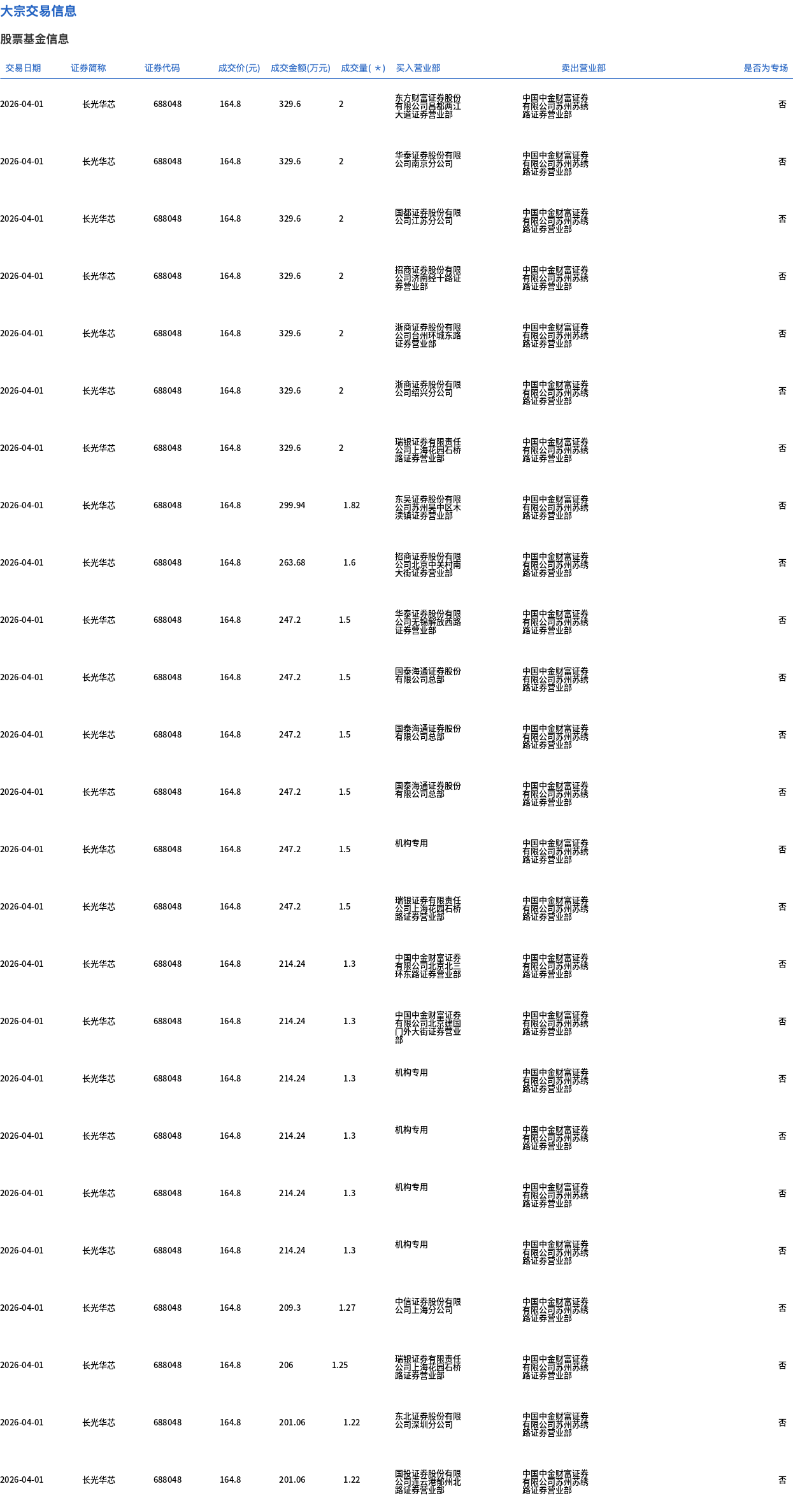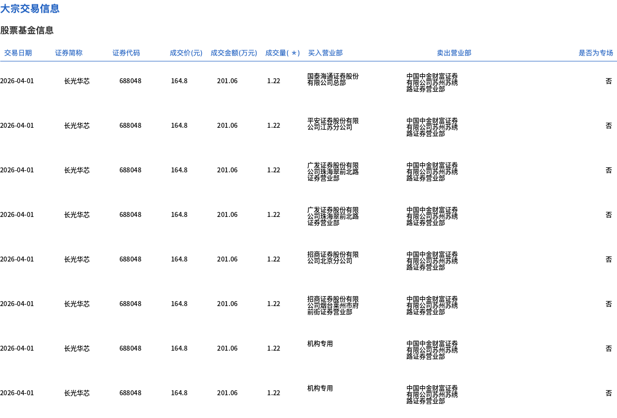 4月1日,長光華芯大宗交易成交163.94萬股,成交額2.7億元,占當日總成交額的7.1%,成交價164.8元,較市場收盤價227.2元折價27.46%。