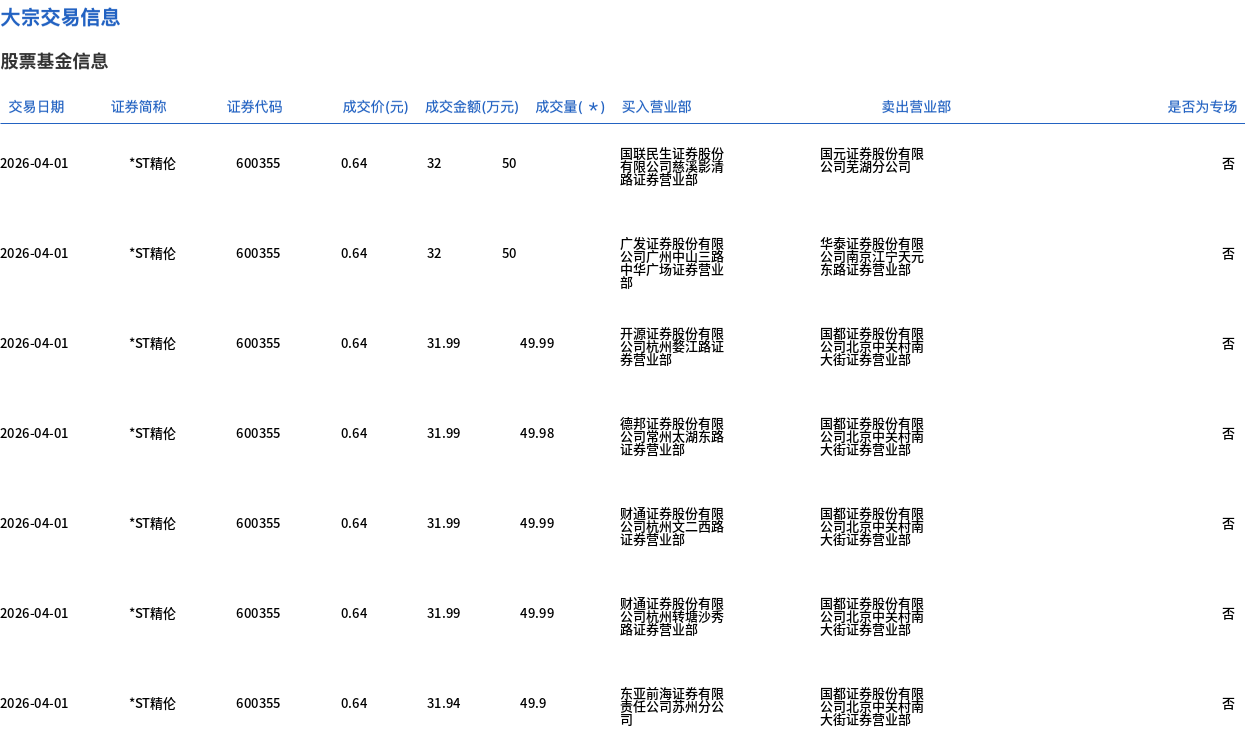 4月1日,*ST精倫大宗交易成交349.85萬股,成交額223.9萬元,占當日總成交額的61.96%,成交價0.64元,較市場收盤價0.64元持平。