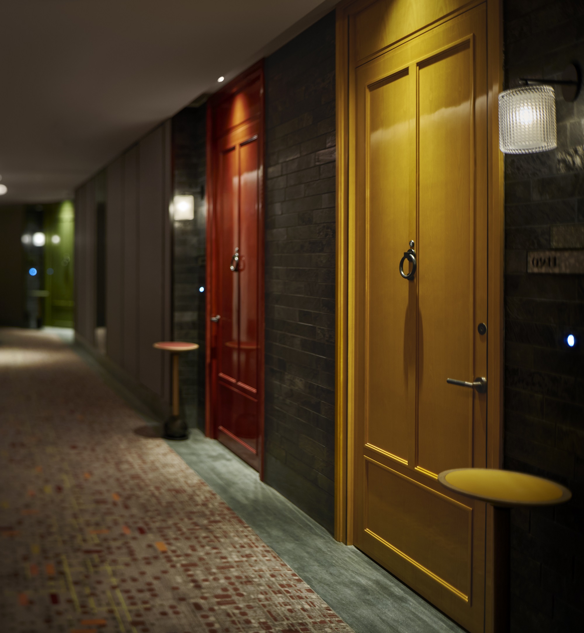 設(shè)計巧思延伸至客房樓層,筆口征哉認(rèn)為,這里值得讓人慢慢挖掘。客房樓層走廊飾以梧桐樹剪影輪廓,每一扇客房門都設(shè)置成彩色門面。