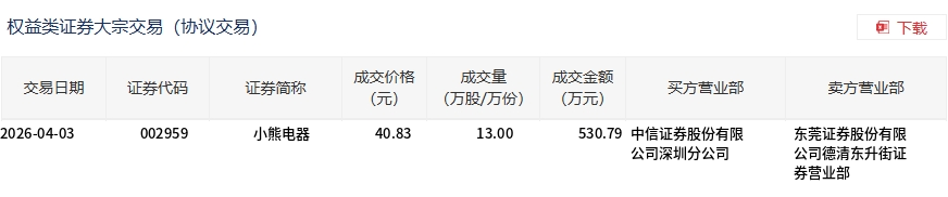 4月3日,小熊電器大宗交易成交13萬股,成交額530.79萬元,占當(dāng)日總成交額的6.1%,成交價40.83元,較市場收盤價43.93元折價7.06%。