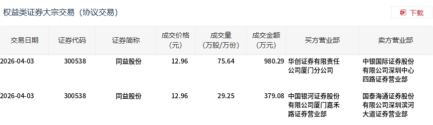 4月3日,同益股份大宗交易成交104.89萬股,成交額1359.37萬元,占當日總成交額的23.17%,成交價12.96元,較市場收盤價13.93元折價6.96%。